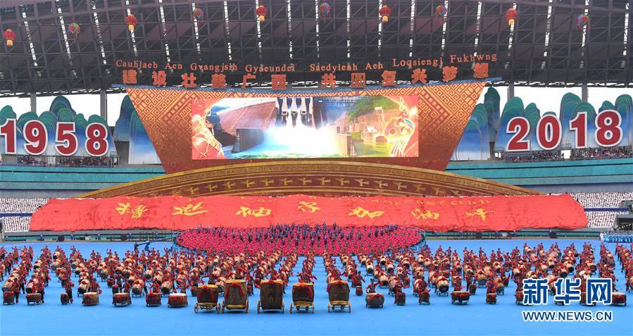 12月10日,廣西壯族自治區(qū)成立60周年慶祝大會在廣西體育中心隆重舉行。這是慶祝大會上的群眾文藝表演。 新華社記者 周華 攝
