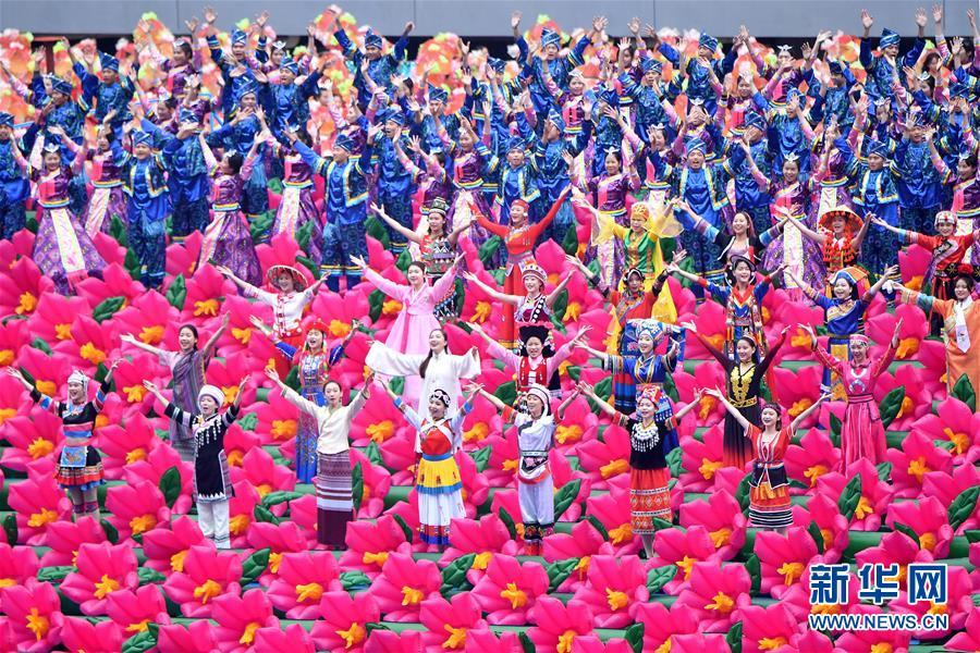 12月10日,廣西壯族自治區(qū)成立60周年慶祝大會在廣西體育中心隆重舉行。這是慶祝大會上的群眾文藝表演。 新華社記者 李鑫 攝