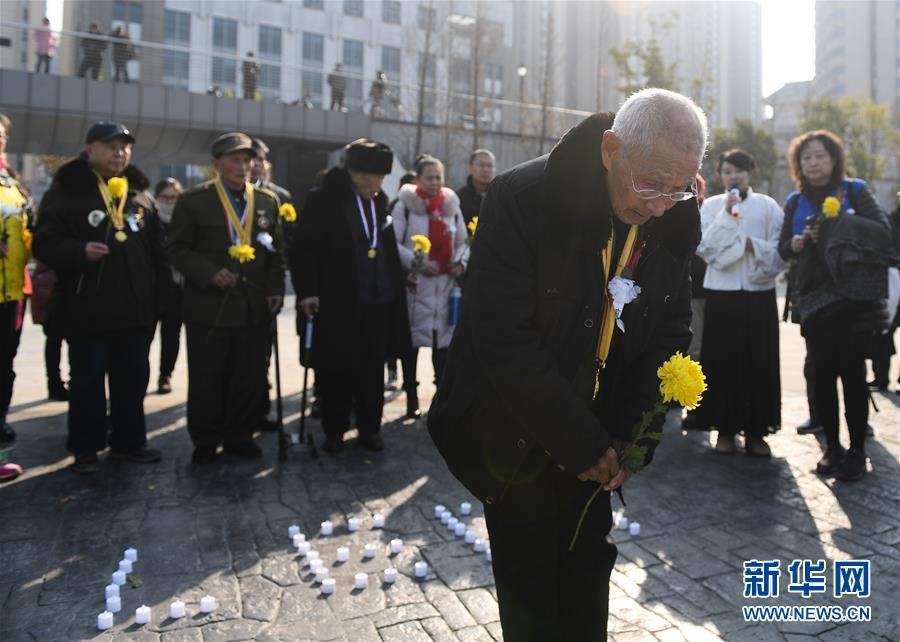 12月12日,來自湖南的抗戰(zhàn)老兵李湘炳(前)等在侵華日軍南京大屠殺中山碼頭遇難同胞紀念碑前祭奠遇難同胞。 當日,來自湖南、江蘇等地的4名抗戰(zhàn)老兵以及志愿者、南京當?shù)卮髮W生代表等來到侵華日軍南京大屠殺中山碼頭遇難同胞紀念碑前獻花、默哀,祭奠遇難同胞。 新華社記者 季春鵬 攝