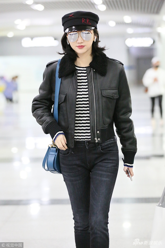 日前,景甜現(xiàn)身機(jī)場(chǎng),身穿黑色皮夾克超有范兒,戴小帽酷似甜美女軍官。視覺(jué)中國(guó)/圖