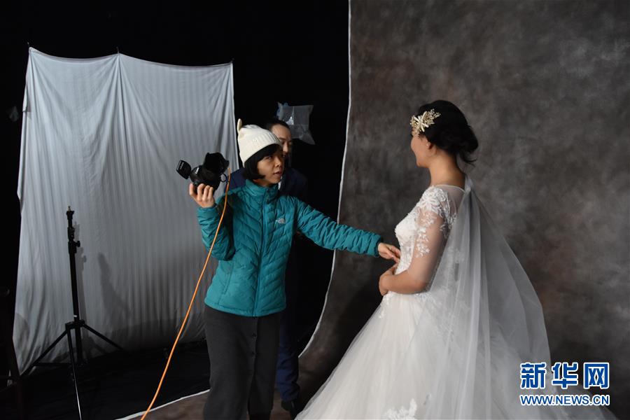 攝影師羅嫻在工地上搭建的臨時(shí)攝影棚內(nèi)指導(dǎo)農(nóng)民工夫妻擺姿勢(shì)(12月10日攝)。 新華社記者 白田田 攝