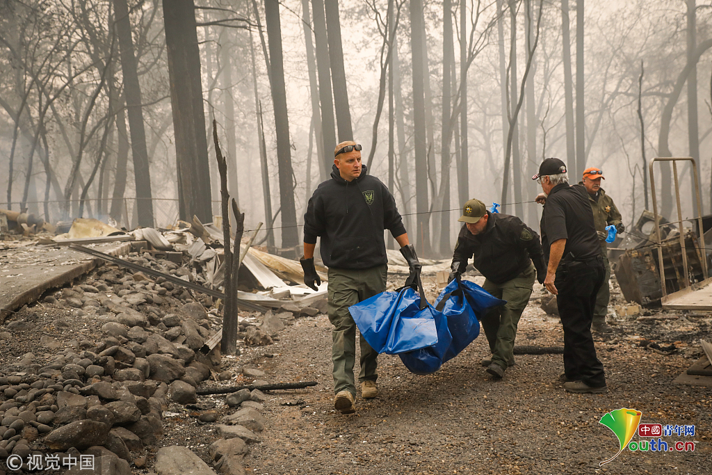 當(dāng)?shù)貢r(shí)間2018年11月10日至11月11日,美國(guó)加州Paradise,當(dāng)?shù)厣交鹚僚?,治安官們?cè)跒?zāi)區(qū)搜尋遇難者遺體。圖片作者:Gabrielle Lurie