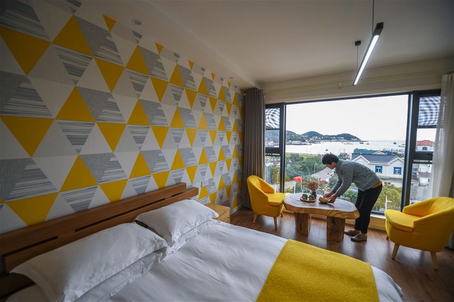 12月15日,工作人員在朱家尖烏石塘“漁夫客?!泵袼蘅头?jī)?nèi)忙碌。 新華社記者 徐昱 攝
