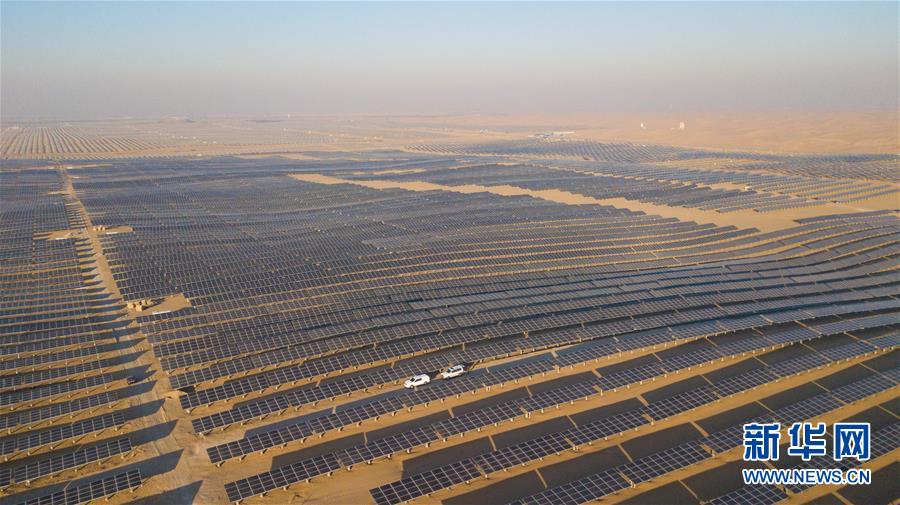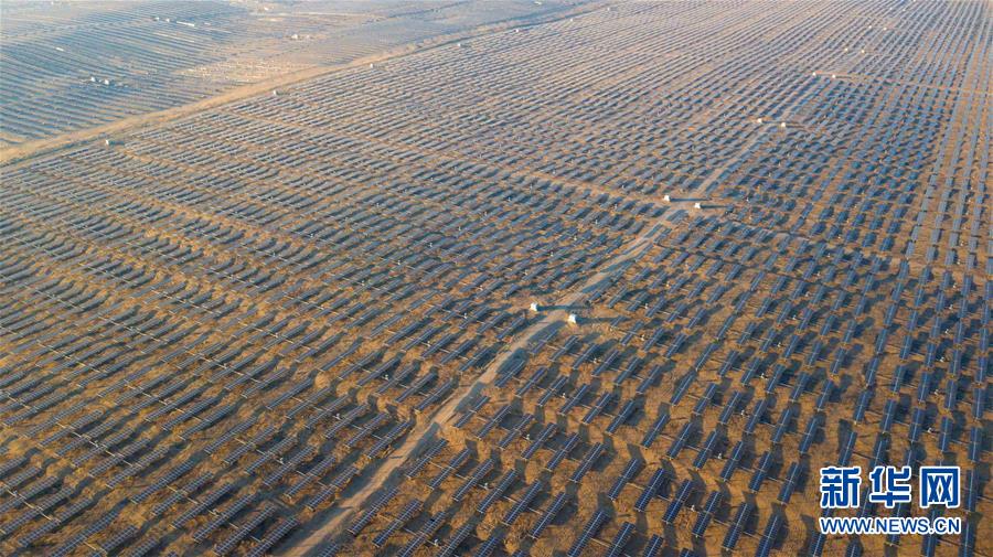 位于庫布其沙漠腹地的達(dá)拉特光伏發(fā)電應(yīng)用領(lǐng)跑基地一期500兆瓦項(xiàng)目(12月13日攝)。