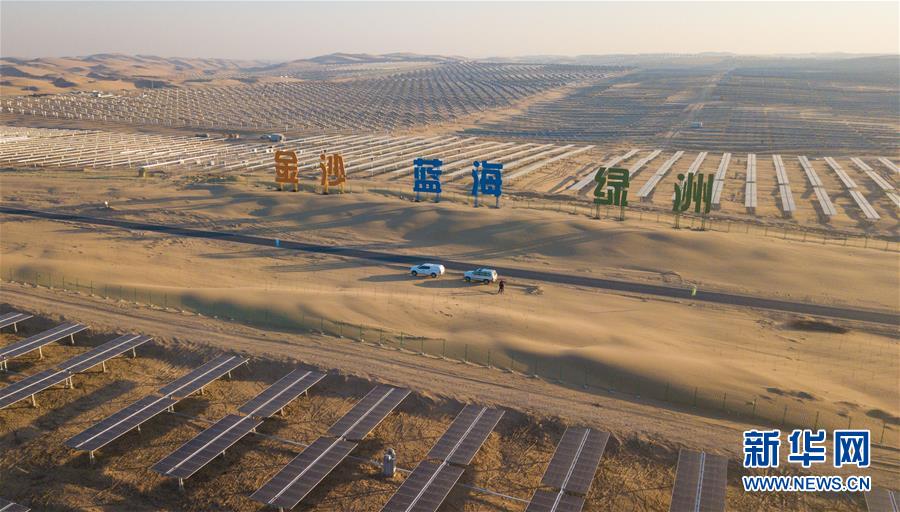 位于庫(kù)布其沙漠腹地的達(dá)拉特光伏發(fā)電應(yīng)用領(lǐng)跑基地一期500兆瓦項(xiàng)目(12月13日無人機(jī)拍攝)。 新華社記者 彭源攝