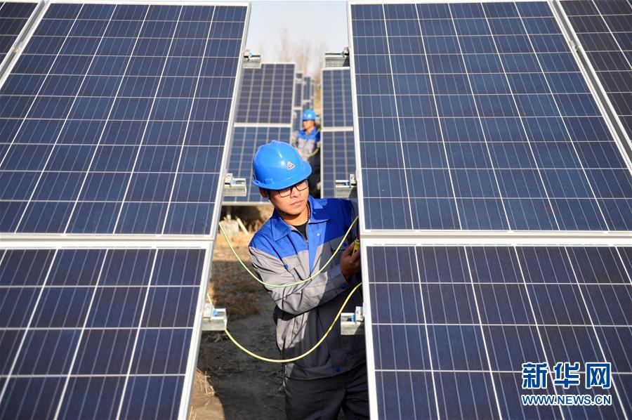 12月15日,工作人員在海興縣蘇基鎮(zhèn)張常豐村村級(jí)光伏扶貧電站維護(hù)光伏設(shè)備。