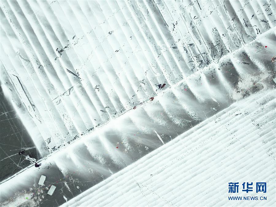 在松花江哈爾濱段江面,工人們在進(jìn)行切割和采冰工作(12月12日無人機(jī)拍攝)。 黑龍江哈爾濱市的冰雪主題樂園哈爾濱冰雪大世界的采冰和建設(shè)工作近日拉開帷幕。為保證足夠的優(yōu)質(zhì)冰供給,每天有近千名采冰人和700多輛運冰車參與到采冰工作。 新華社記者 王松 攝