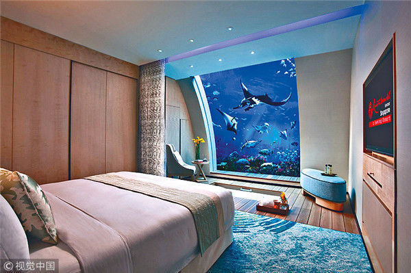 2018年4月25日,海南三亞,亞特蘭蒂斯酒店的海王星水下套房,魚在窗外游泳。