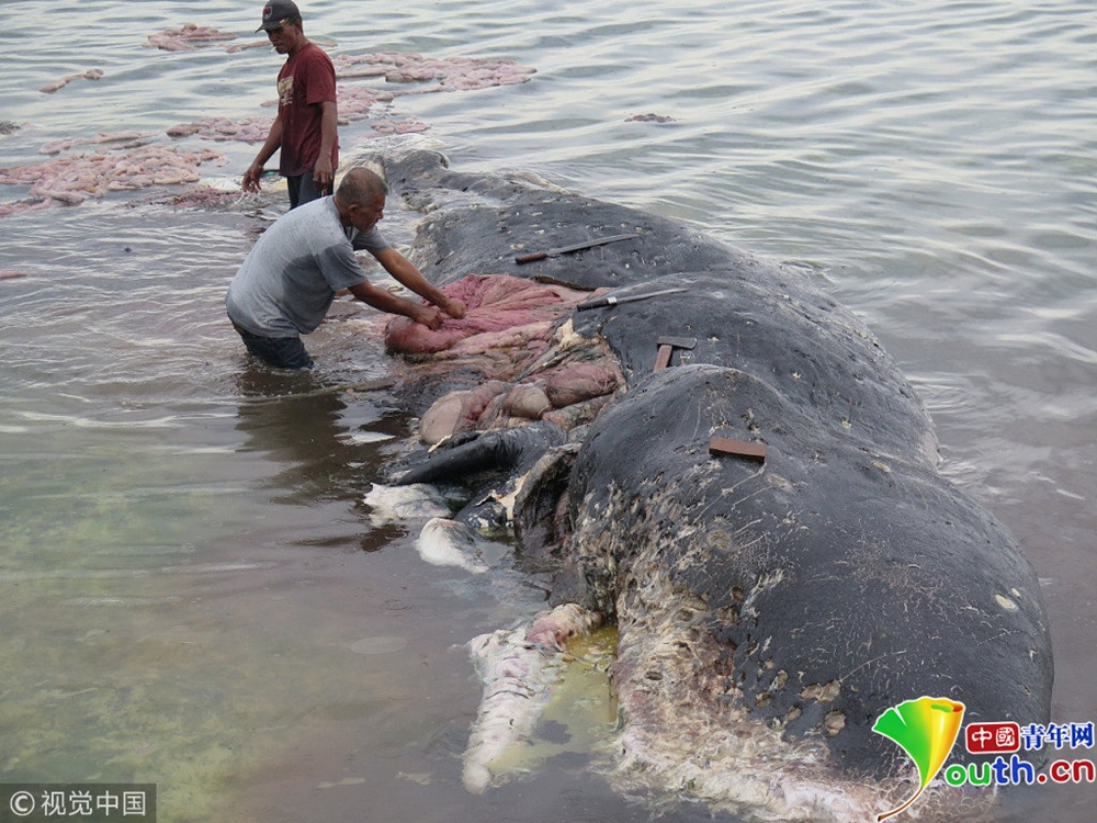 鯨魚(yú)擱淺印尼海岸 肚子里滿是塑料垃圾