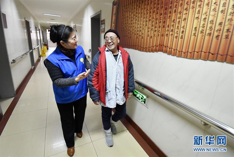 12月17日,豐臺區(qū)長辛店街道車輛廠社區(qū)養(yǎng)老服務驛站的員工陪同她們通過“連心通”救助的突發(fā)疾病獨居老人連鐵良(右)做康復。 新華社記者 李欣 攝