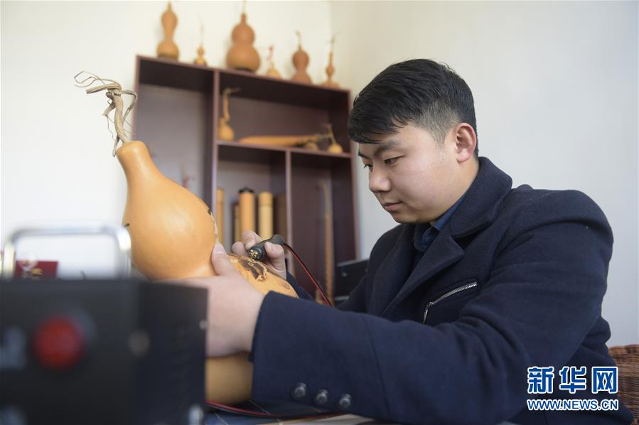 12月18日,劉征在自己的加工坊里進(jìn)行葫蘆烙畫創(chuàng)作。 新華社記者 魯鵬 攝