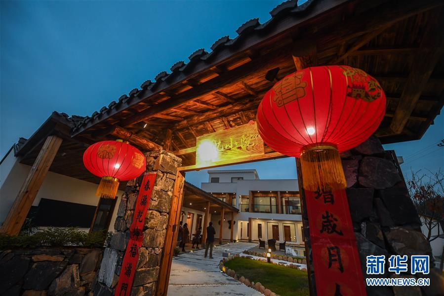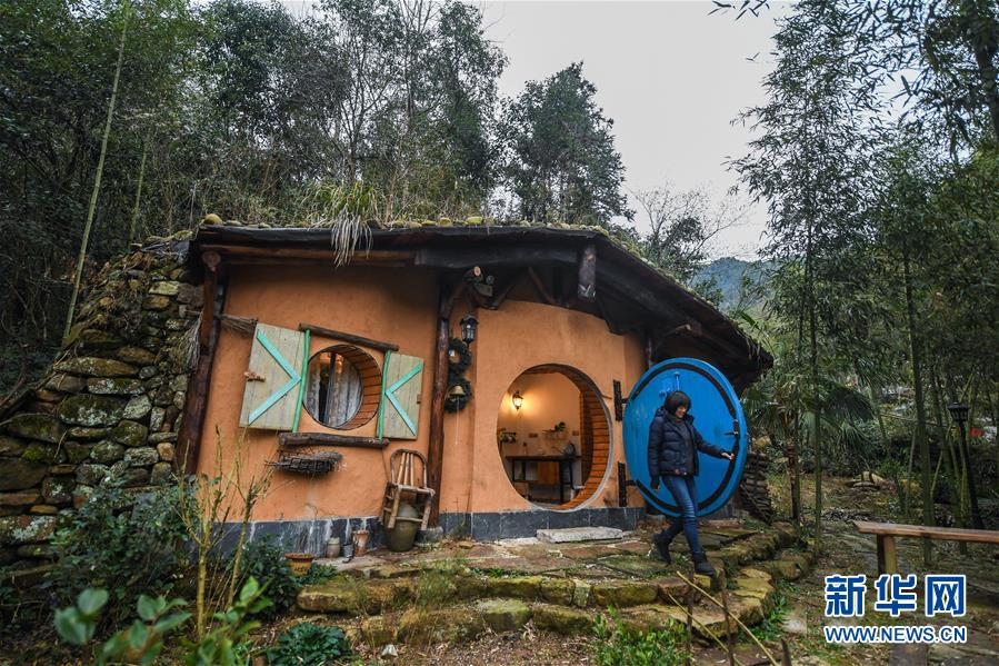 12月19日,客人走進(jìn)民宿“僻地寒樓”。該民宿共有7幢風(fēng)格各異的小屋分布在山坡上,頗具特色。河橋鎮(zhèn)青年張雁辭去了上海的工作,回到家鄉(xiāng)開辦了這家民宿。 新華社記者 徐昱 攝