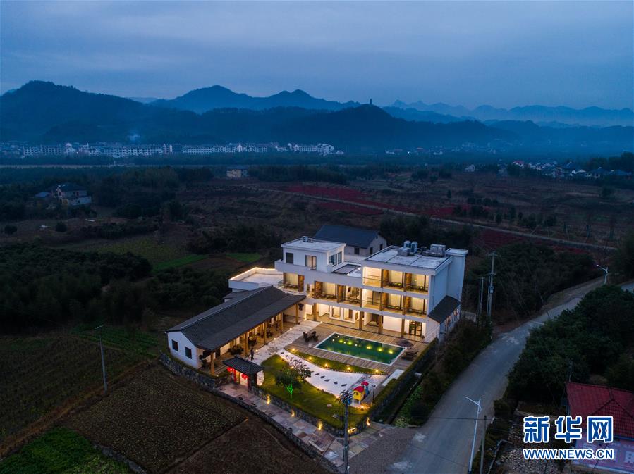 12月19日,空中俯瞰夜色中的民宿“初憶小院”(無人機拍攝)。該民宿是河橋鎮(zhèn)“90后”女孩章淑貞開辦的,民宿融入了大量的現(xiàn)代建筑設(shè)計風(fēng)格,深受年輕人的喜愛。 新華社記者 徐昱 攝
