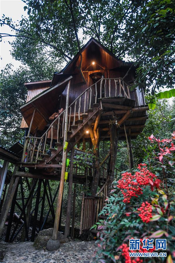 這是民宿“僻地寒樓”的一間樹屋(12月19日攝)。該民宿共有7幢風(fēng)格各異的小屋分布在山坡上,頗具特色。河橋鎮(zhèn)青年張雁辭去了上海的工作,回到家鄉(xiāng)開辦了這家民宿。 新華社記者 徐昱 攝