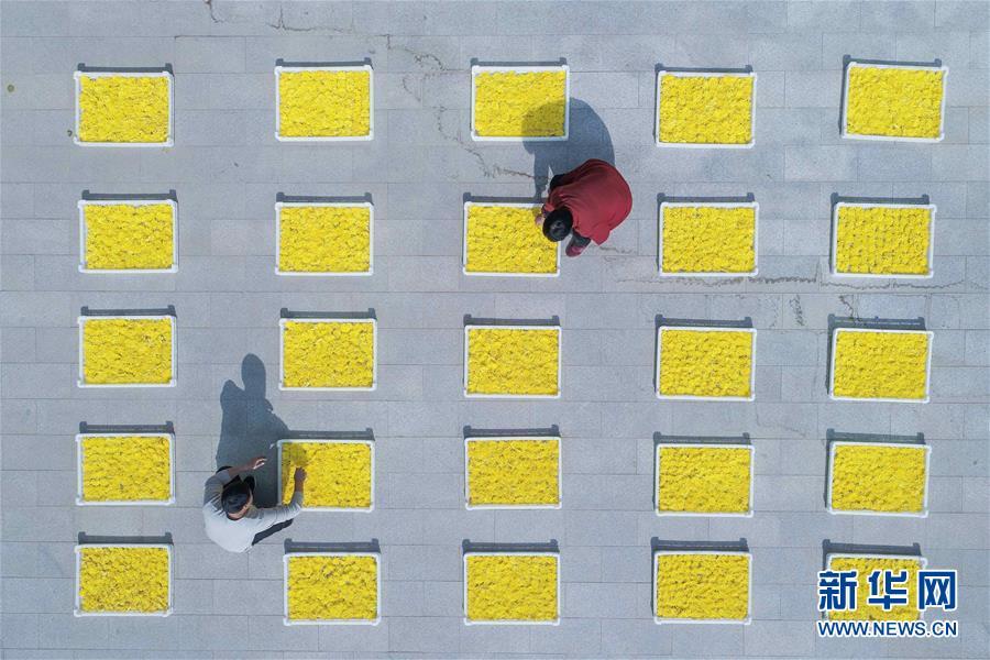 2018年11月7日,河北省魏縣魏城鎮(zhèn)町上村農(nóng)民在分揀晾曬菊花。 大地之色,俯仰之間;壯美山河,是我的祖國。2018年,新華社記者操縱無人機(jī)“飛閱”華夏大地,在最美的時節(jié),定格下她的色彩斑斕。 新華社記者 朱旭東 攝