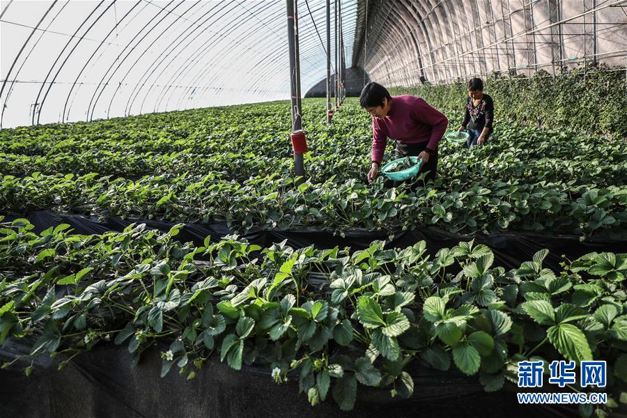 12月19日,農(nóng)戶在大棚里管理草莓。 2017年5月,遼寧省鐵嶺市昌圖縣大四家子鎮(zhèn)方家船口村利用土地確權(quán)成果,由村兩委班子成員領(lǐng)辦創(chuàng)辦了昌圖久晟果木蔬菜種植專業(yè)合作社。到2018年9月,合作社利用產(chǎn)業(yè)扶貧資金、壯大村集體經(jīng)濟(jì)扶持資金、村集體用地和村民入股資金建成了11個(gè)“股份制大棚”,主要種植草莓等作物,產(chǎn)品通過電商銷往云南、四川、北京、上海等地,預(yù)計(jì)第一期可為265名貧困戶每人分紅860元。 新華社記者潘昱龍攝
