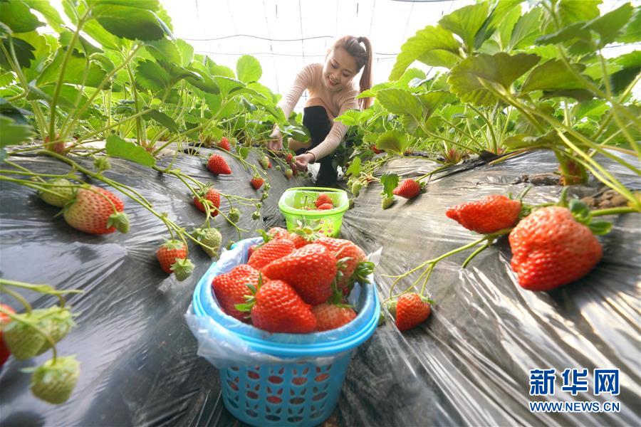 12月20日,游客在唐山市豐潤區(qū)眾浩草莓種植專業(yè)合作社大棚內(nèi)采摘草莓。 新華社記者 牟宇攝