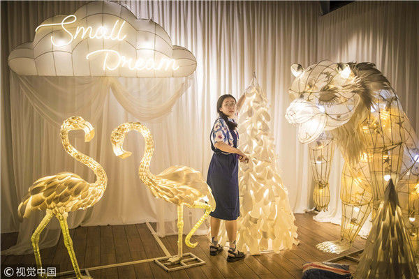 2018年5月6日,廣州,在天河區(qū)一家大商場辦個(gè)展時(shí),用紙片做成的北極熊、大松樹、火烈鳥、紙房子在光線的配合下美輪美奐,吸引了很多顧客駐足?!皫缀趺總€(gè)人一看到,都會(huì)走進(jìn)那個(gè)夢幻的場景里,和這些紙雕一起合影?!眻D片攝于2018年5月6日。南塘/視覺中國