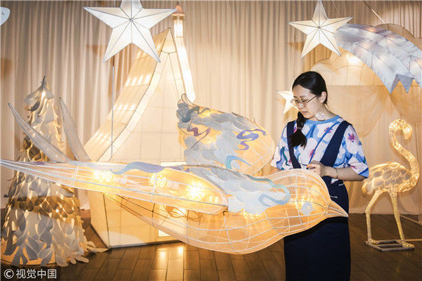 2018年5月6日,廣州,在天河區(qū)一家大商場辦個展時,用紙片做成的北極熊、大松樹、火烈鳥、紙房子在光線的配合下美輪美奐,吸引了很多顧客駐足?!皫缀趺總€人一看到,都會走進(jìn)那個夢幻的場景里,和這些紙雕一起合影。”圖片攝于2018年5月6日。
