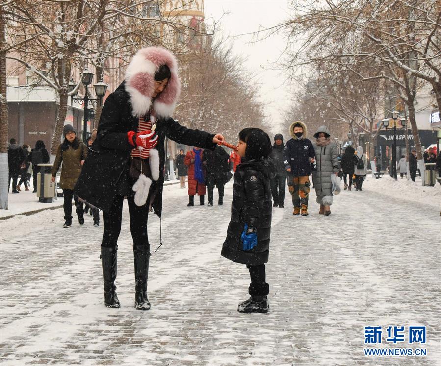 12月21日,游客在哈爾濱中央大街游覽。當日,“冰城”哈爾濱迎來降雪天氣,整個城市變得銀裝素裹。新華社記者韓宇攝