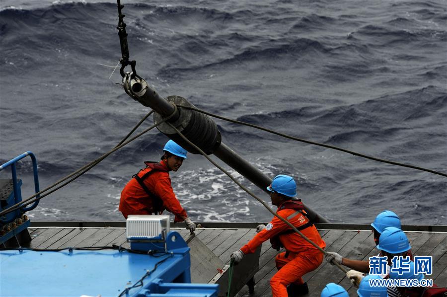 科考團(tuán)隊(duì)成員林剛(左)、程淞(右)回收重力柱(12月20日攝)。