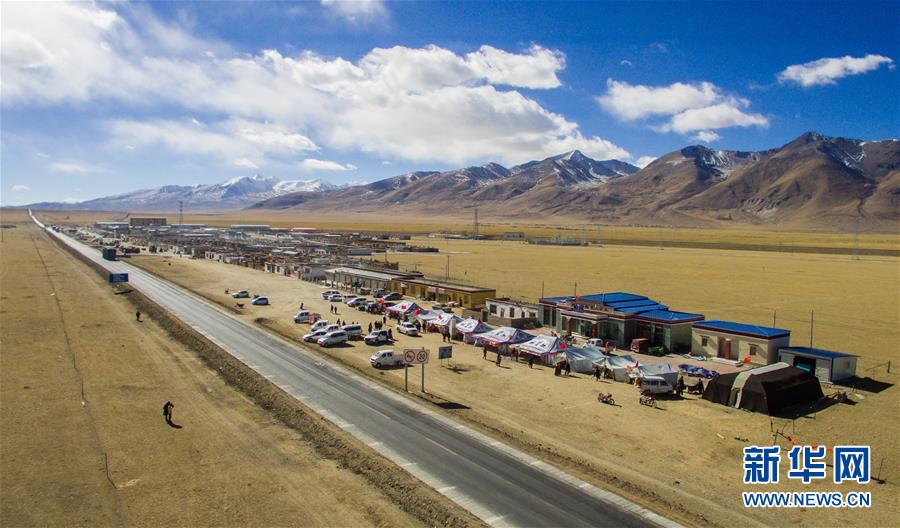 這是在青藏公路旁搭建的那曲縣香茂鄉(xiāng)畜產(chǎn)品展銷會(2017年11月25日無人機拍攝)。 新華社記者 劉東君 攝