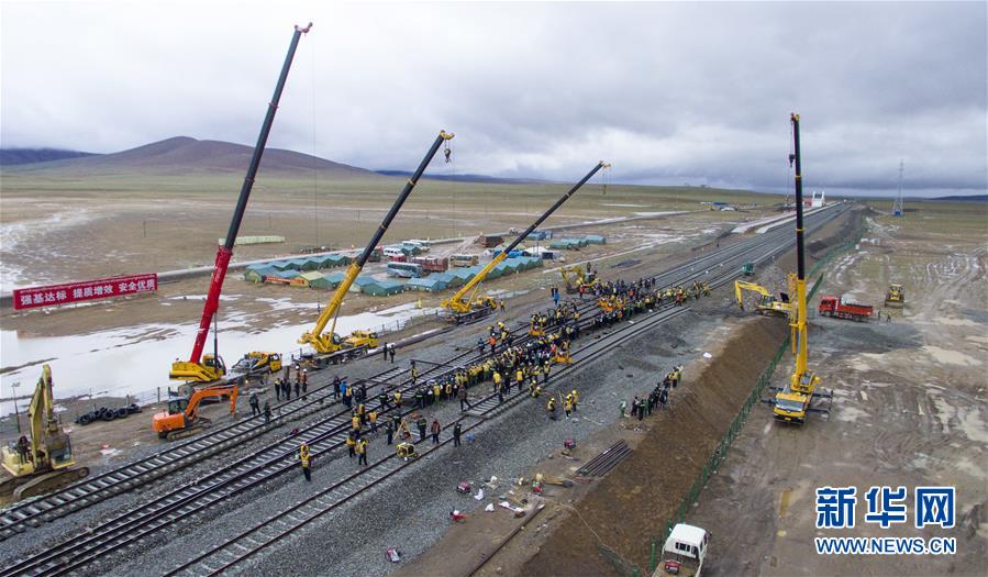 這是2017年7月26日無人機拍攝的青藏鐵路格爾木至拉薩段擴能改造工程唐古拉車站撥接工作現(xiàn)場。 新華社記者 劉東君 攝