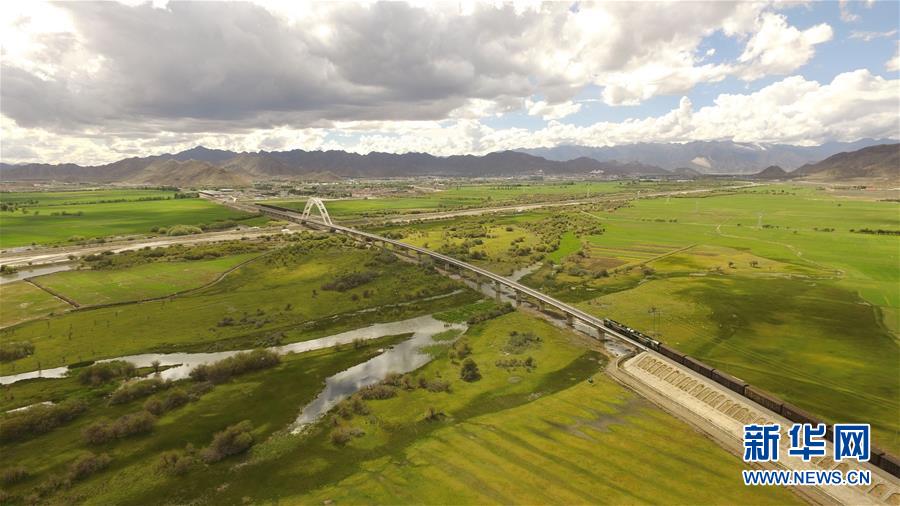 列車在青藏鐵路延長線拉日鐵路上行駛(2016年6月17日無人機拍攝)。 新華社記者 劉東君 攝