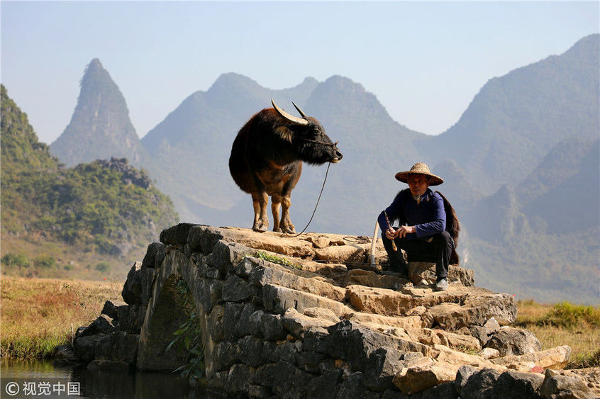 2018年12月17日,廣西桂林。用不到3年時(shí)間,農(nóng)民許修保愣是將自己家的水牛訓(xùn)練得走上了貓步,這讓來自全國各地的游客嘖嘖稱奇:你這么牛,維密天使情何以堪?憑著與水牛的聯(lián)袂演出,一個(gè)月下來,老許會(huì)有兩三萬的收入進(jìn)賬,佩服得左鄰右舍紛紛向他伸出了大拇指。棋簿紫/視覺中國
