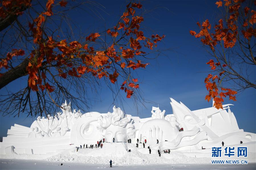 12月24日,雪雕師在制作太陽島雪博會主塑“星河之旅”。 當日,哈爾濱太陽島雪博會主塑露出“芳容”。本屆雪博會主塑“星河之旅”長106米,高32米,寬20米,用雪量達4萬立方米。 新華社記者 王建威 攝