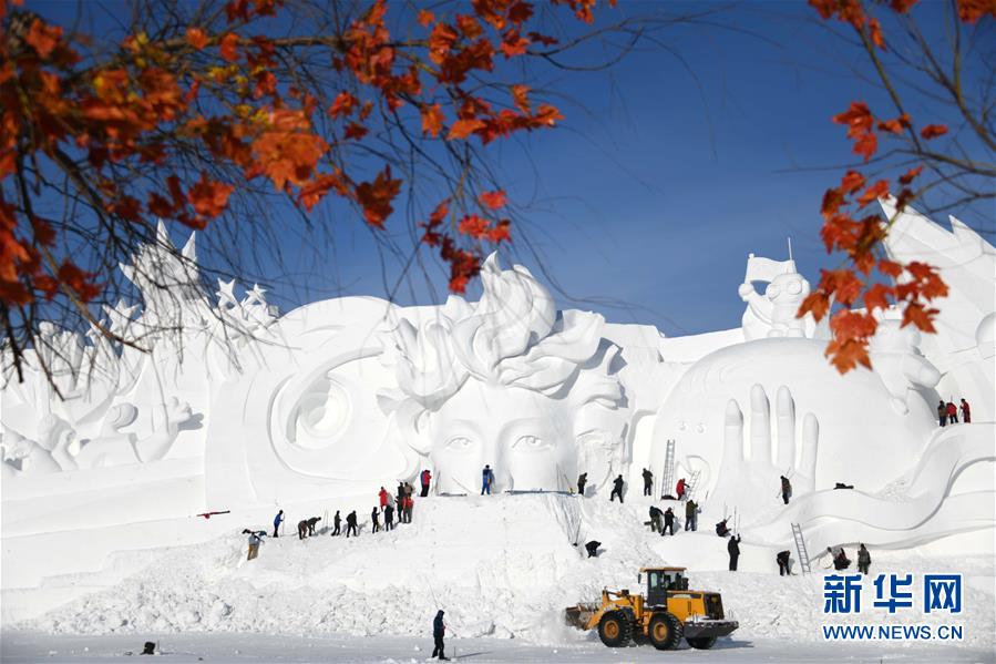 12月24日,雪雕師在制作太陽島雪博會主塑“星河之旅”。 當日,哈爾濱太陽島雪博會主塑露出“芳容”。本屆雪博會主塑“星河之旅”長106米,高32米,寬20米,用雪量達4萬立方米。 新華社記者 王建威 攝