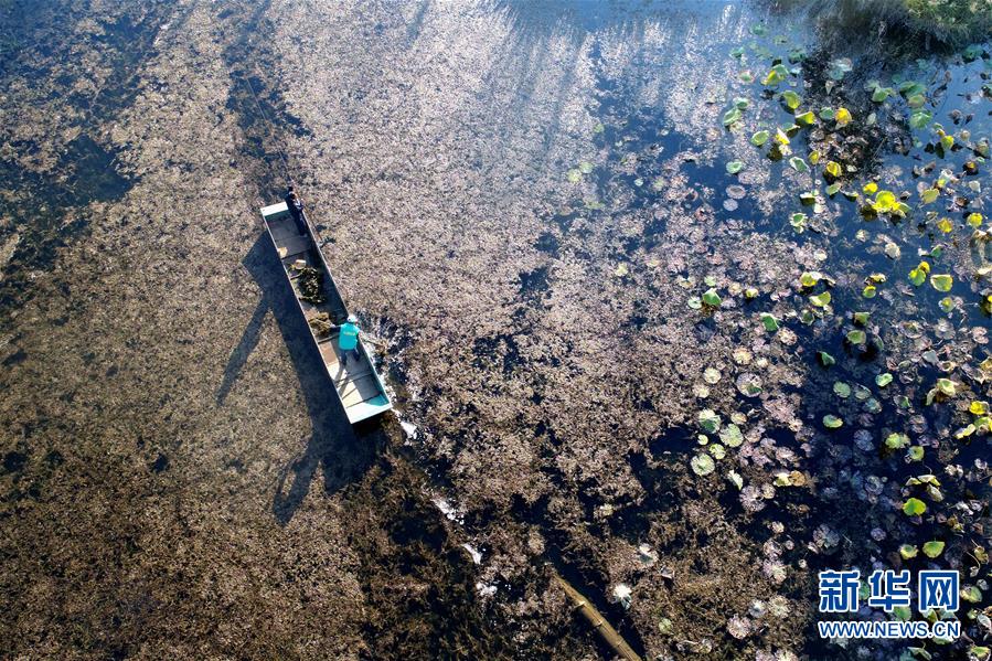 工作人員清理水生植物,保持洱海水體清潔(11月16日攝)。