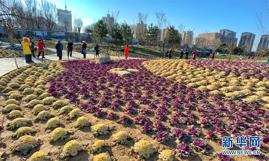 12月24日,游人在北京玉淵潭公園觀賞甘藍(lán)。 日前,北京市玉淵潭公園移栽的三萬(wàn)多棵紫色和黃色羽衣甘藍(lán)盛開,為冬季公園增添了色彩。 新華社記者李欣攝