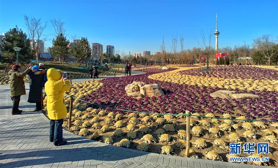 12月24日,游人在北京玉淵潭公園觀賞甘藍。 日前,北京市玉淵潭公園移栽的三萬多棵紫色和黃色羽衣甘藍盛開,為冬季公園增添了色彩。 新華社記者李欣攝
