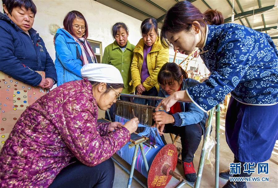 12月25日,在衡水市冀州區(qū)一家老粗布生產(chǎn)企業(yè),田園棉手織粗布傳承人(右一)在指導(dǎo)村民學(xué)習(xí)田園棉手織粗布技藝。 2018年以來,河北省衡水市冀州區(qū)依托當(dāng)?shù)氐氖〖?jí)非遺田園棉手織粗布技藝資源,采取“非遺+扶貧”的模式,通過非遺傳承人開展技能培訓(xùn)、老師傅傳幫帶等,讓貧困村民在傳承非遺文化的同時(shí)學(xué)習(xí)傳統(tǒng)技藝,助力脫貧致富。 新華社記者 李曉果 攝
