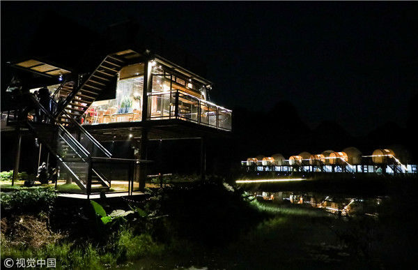 2018年12月17日,廣西桂林,陽朔縣遇龍河畔。夜色中的泡泡屋觀景臺(tái)。
