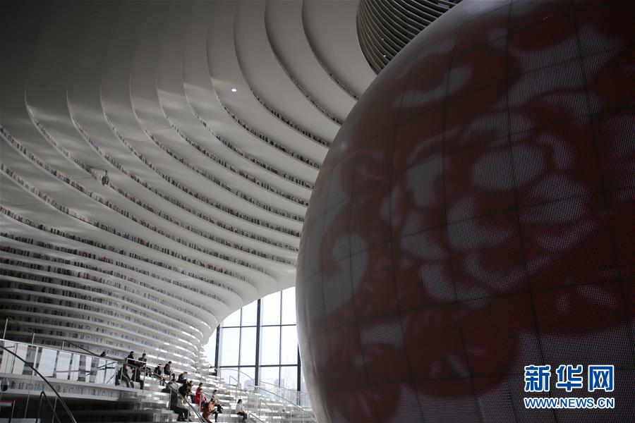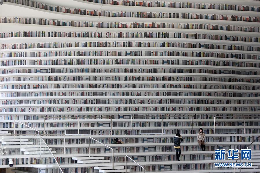 12月27日,讀者參觀天津?yàn)I海新區(qū)圖書館中庭。 濱海新區(qū)圖書館位于天津?yàn)I海文化中心,2017年10月1日正式開館,設(shè)計(jì)立意為“濱海之眼”和“書山有路勤為徑”。圖書館現(xiàn)有藏書60多萬冊(cè),一年多來接待讀者約280萬人次,已成為濱海新區(qū)的文化“新地標(biāo)”。 新華社記者段卓力攝
