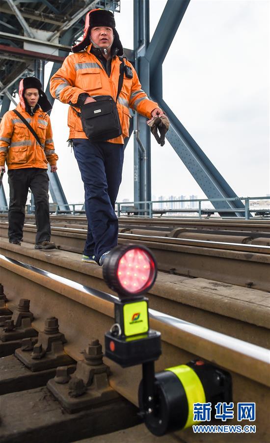 鄭煒(右)和工友在南京長江大橋鐵路橋上進(jìn)行日常巡查(12月27日攝)。