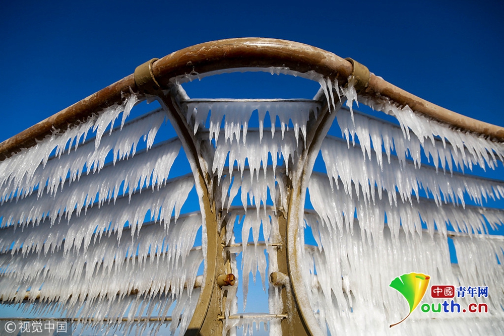 2018年12月29日,大連市迎來入冬以來最冷-12℃的低溫,在大風和潮汐的作用下,海水在岸邊的護欄上瞬間凝固,凝結(jié)并形成大面積形狀各異的冰凌,在延綿5公里的木棧道上形成奇特的冰凌奇觀。