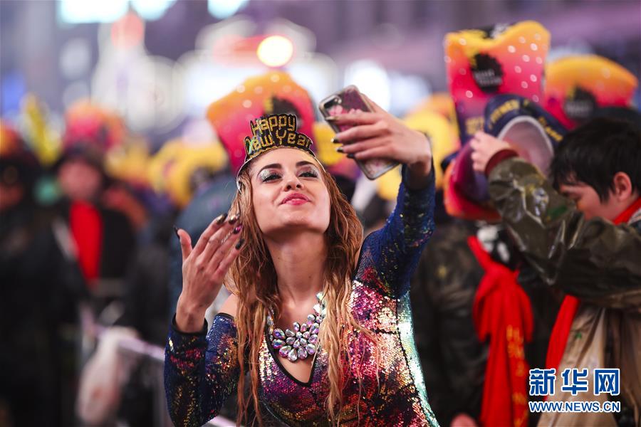 1月1日,在美國紐約時(shí)報(bào)廣場,一名女子在新年鐘聲敲響后自拍。 新華社記者王迎攝