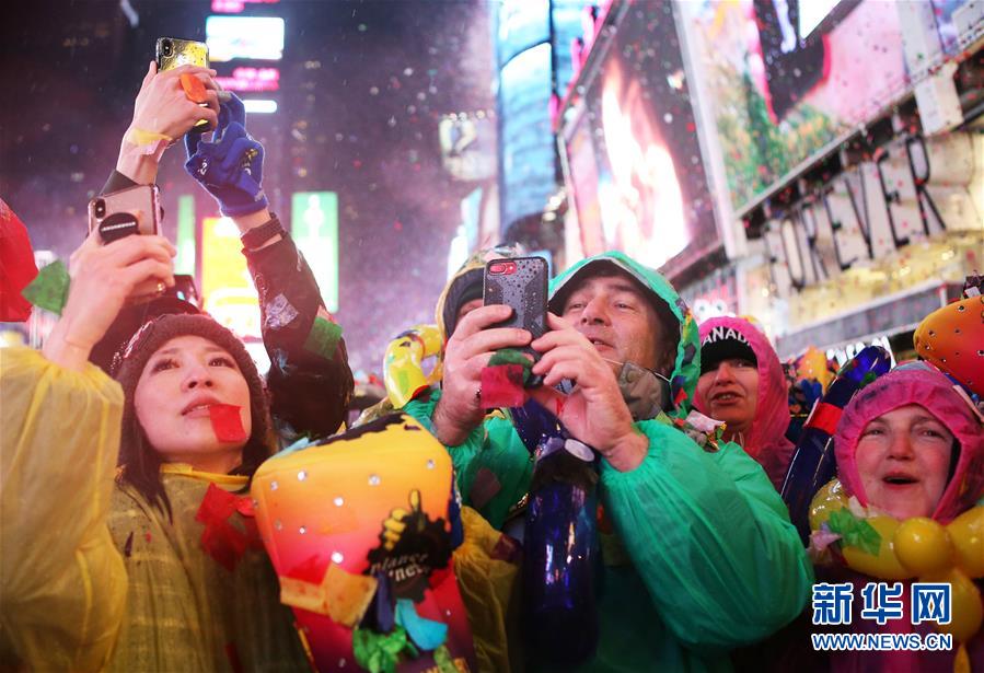 1月1日,在美國紐約時報廣場,人們在雨中參加跨年活動。 新華社記者秦朗攝