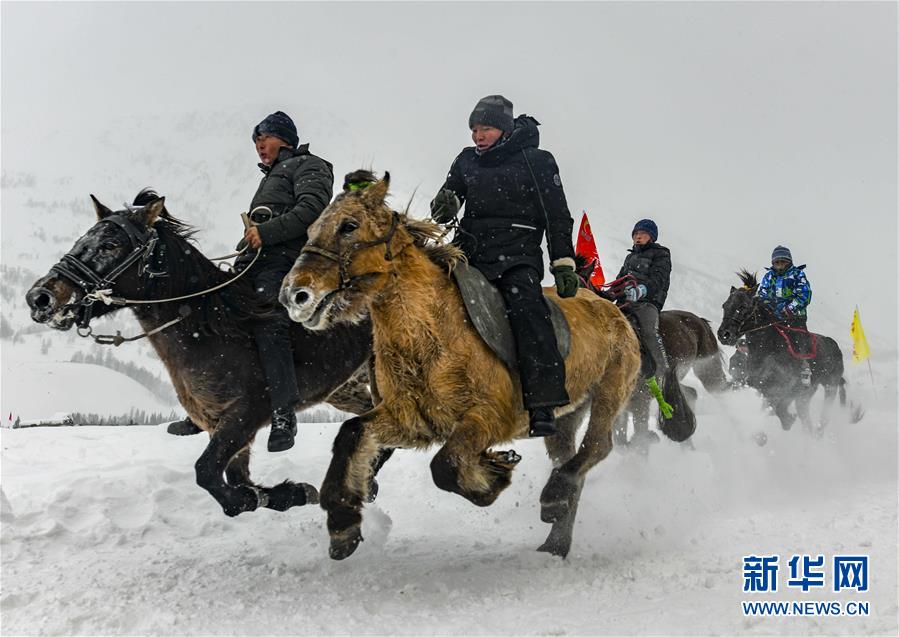 1月1日,在新疆禾木雪鄉(xiāng),當(dāng)?shù)鼐用癖硌菅┑刭愸R。