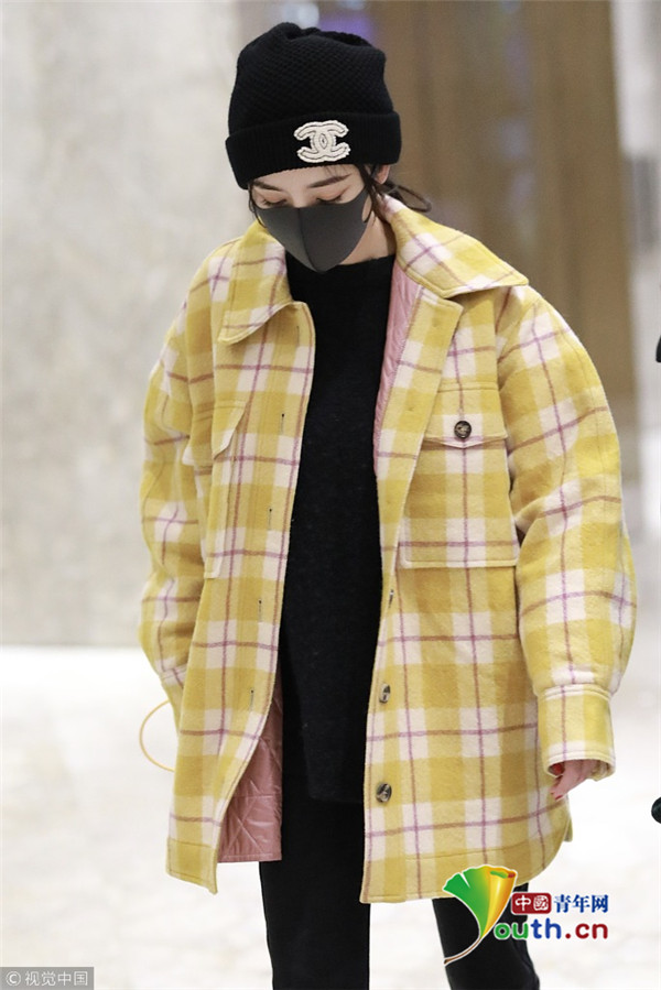 2018年1月6日,上海,楊冪現(xiàn)身某酒店。她戴著帽子口罩,身穿黑色套裝,而外面搭配的奶黃格子外套卻瞬間減齡,明亮又惹眼,無懼寒冬露著纖細腳踝,依舊是那個很會穿搭的大冪冪。