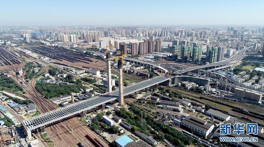 9月7日無人機(jī)拍攝的鄭北大橋鋼梁頂推施工現(xiàn)場。當(dāng)日,跨越鄭州北站的鄭北大橋鋼梁頂推成功。鄭北大橋是東西走向的鄭州市農(nóng)業(yè)路快速通道工程的一部分,需跨越鄭州北站。由于列車不能中斷運行,鄭北大橋不能采用常見的搭腳手架方式施工,而是采用頂推法,即在大橋一端把橋身拼接好,然后一段一段朝著鐵路編組站上方送過去,最終完成橋梁架設(shè)。新華社記者朱祥攝
