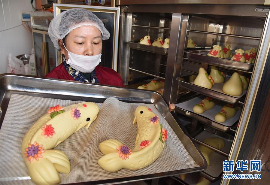 1月8日,工作人員準(zhǔn)備將做好的花餑餑放入蒸箱。 新華社記者 李紫恒 攝