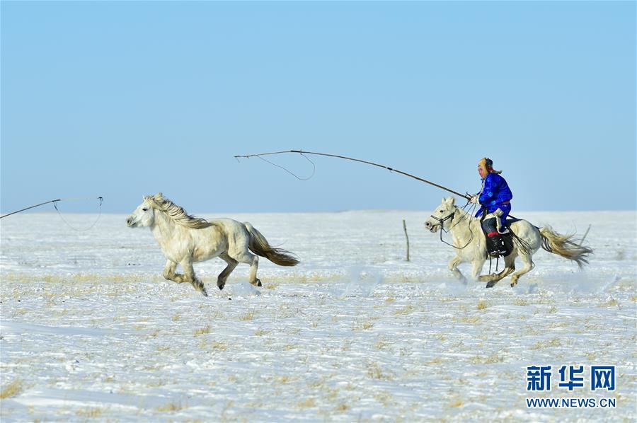 1月8日,牧民進行套馬表演。 時下正值草原冬季旅游旺季,內蒙古自治區(qū)西烏珠穆沁旗的牧民們在雪原上一展身手,為游客展現(xiàn)獨特的民族風情。 新華社記者 鄒予 攝