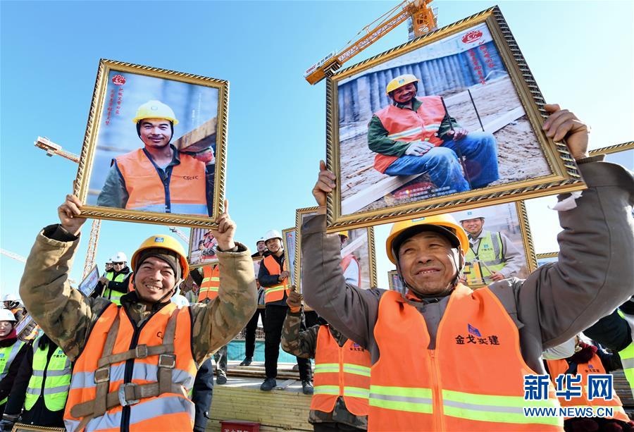 1月9日,中建一局北京城市副中心周轉房項目工地的建筑工人在展示自己的照片。 當日,由北京市總工會主辦的工會“兩節(jié)”送溫暖活動之一的“把微笑帶回家,為最美勞動者點贊”大型公益活動,在中建一局北京城市副中心職工周轉房項目工地舉行。眾多勞動者獲贈“微笑”肖像照和保溫壺、毛巾等新春“大福包”。 新華社記者 李欣 攝
