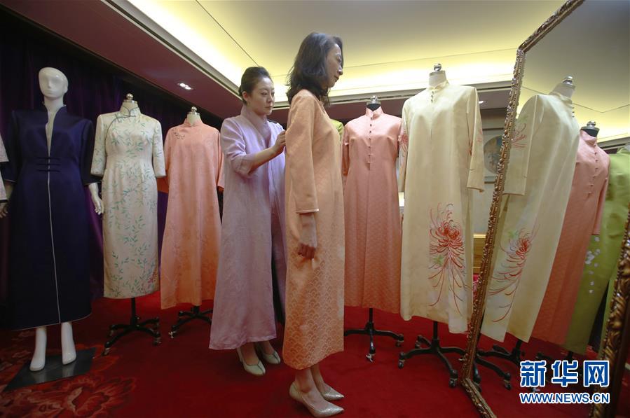 1月12日,在北京“碧泓云想”服裝設(shè)計工作室,高定服裝設(shè)計師畢紅(左)與顧客交流中式服裝款式的設(shè)計細(xì)節(jié)。畢紅設(shè)計的中式服裝以棉、麻、真絲等面料為主。春節(jié)來臨,其團(tuán)隊(duì)加班加點(diǎn)為顧客趕制中式服裝。