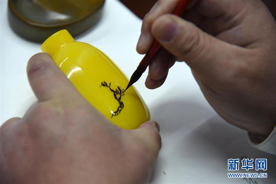 1月11日,孫云毅在為一只雞油黃鼻煙壺作畫(huà)。 新華社記者王凱攝