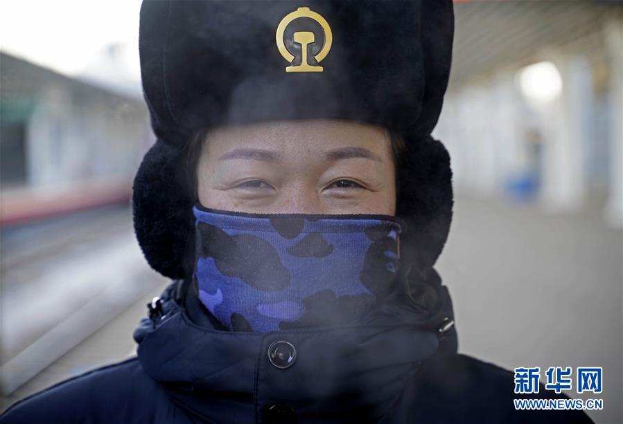 1月11日,在滿洲里火車站站臺,“金鑰匙”服務(wù)臺客運員在嚴寒中等待列車進站。